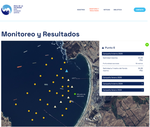 El sitio contiene toda la información del funcionamiento de la mesa y principalmente da cuenta de las campañas de medición de la salinidad que se iniciaron en 2024 y a la fecha ya suman 5 campañas y que permiten construir la línea base de salinidad de la bahía antes de la entrada en operación de la planta desalinizadora de Aguas Pacífico.
